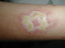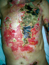 76 years old, male, with severe anemia and cardiac failure, who suffered a domestic scald producing a full-thickness burn of the anterior chest. The biologicalk status of this very ill patient forbids any aggressive surgery such as early tangential excision and grafting.