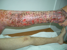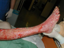 41 years old, male, extensive full-thickness circumfrerential flame burn of the right lower limb; tangential excission followed by passive debridement with LIGASANO® white and skin grafting. Complete healing in about two month.