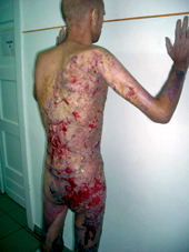 36 years old, male, with full-thickness flame burn and inhalation injuries.