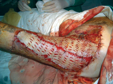 26 years old, male, with a full-thickness circumferential burn of the left leg, treatet first by tangential excision and followed by passive debridement with LIGASANO® white until the wound bed was fully granulated and able to receive a split-thickness skin graft. This case has been cured in about two month.